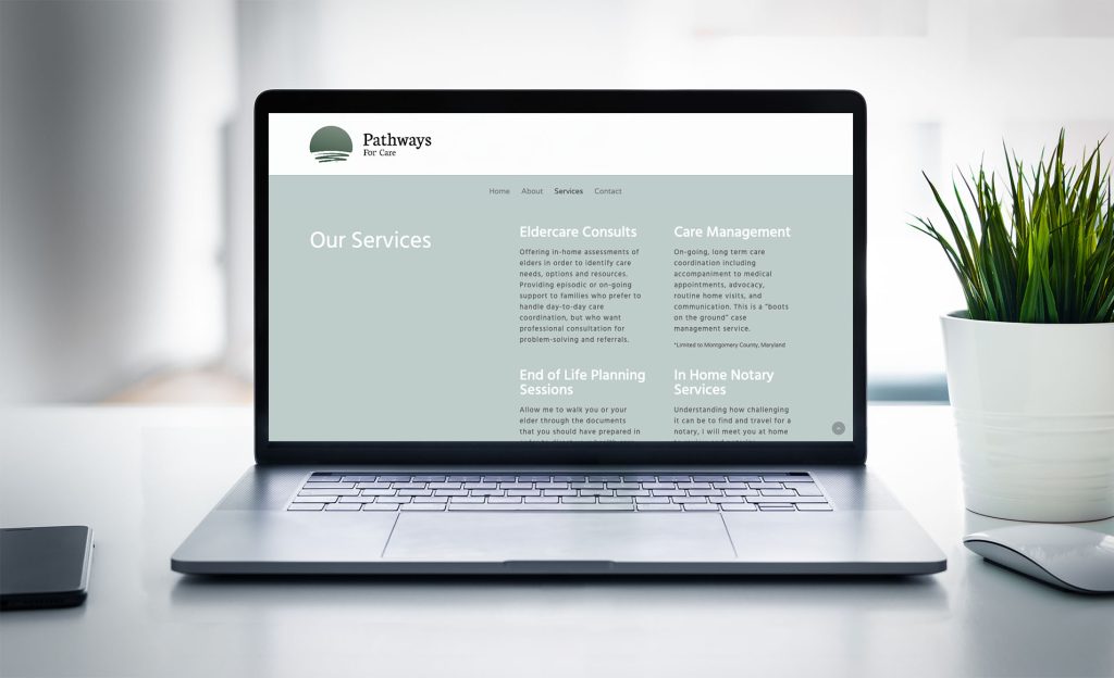 For Pathways for Care, we crafted a simple, minimalist one-page website that showcases the services they provide to help older adults and their families in end-of-life planning. To incorporate a peaceful, relaxing and calming vibe, we went with a spa green, light grey color scheme.