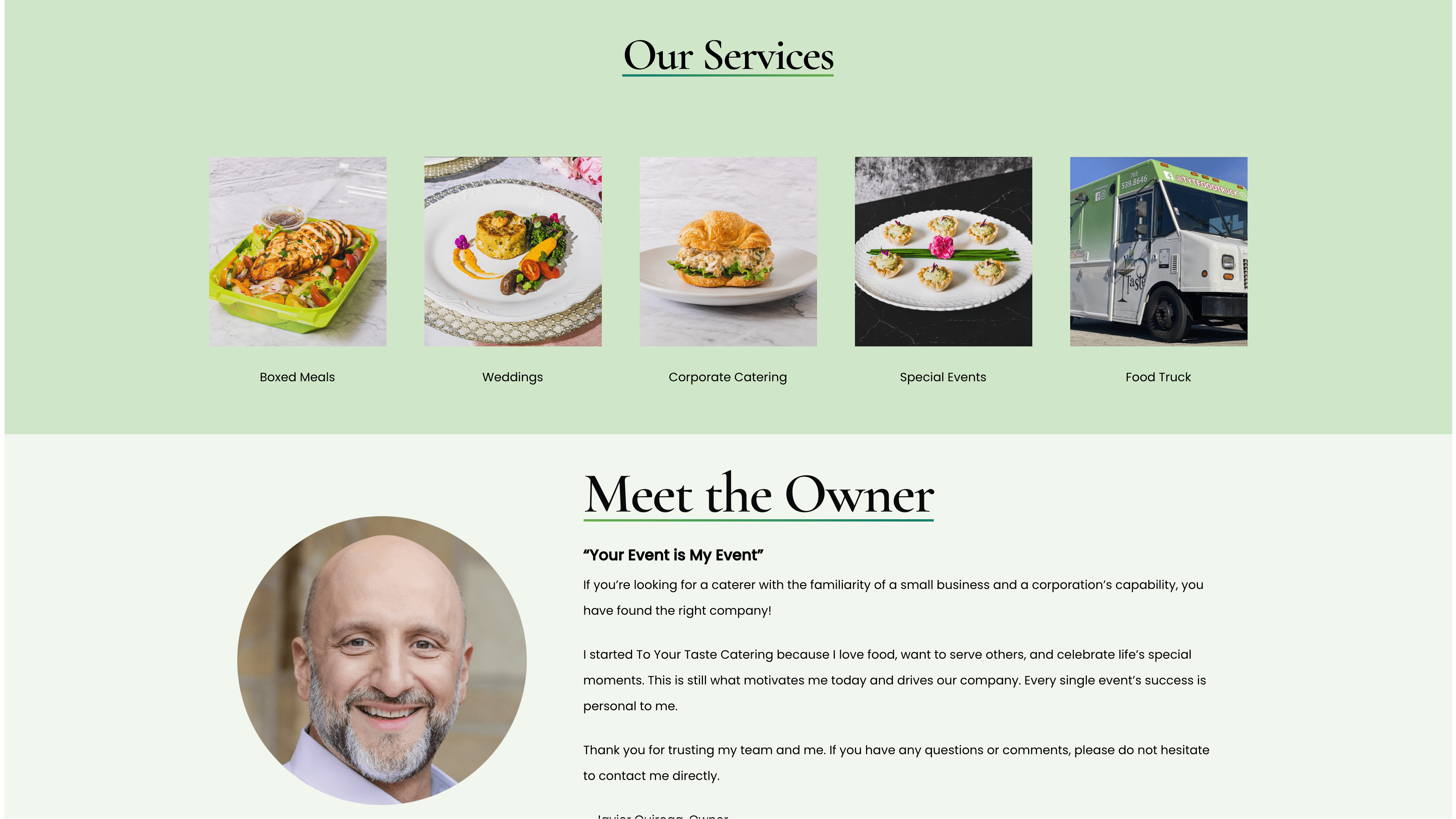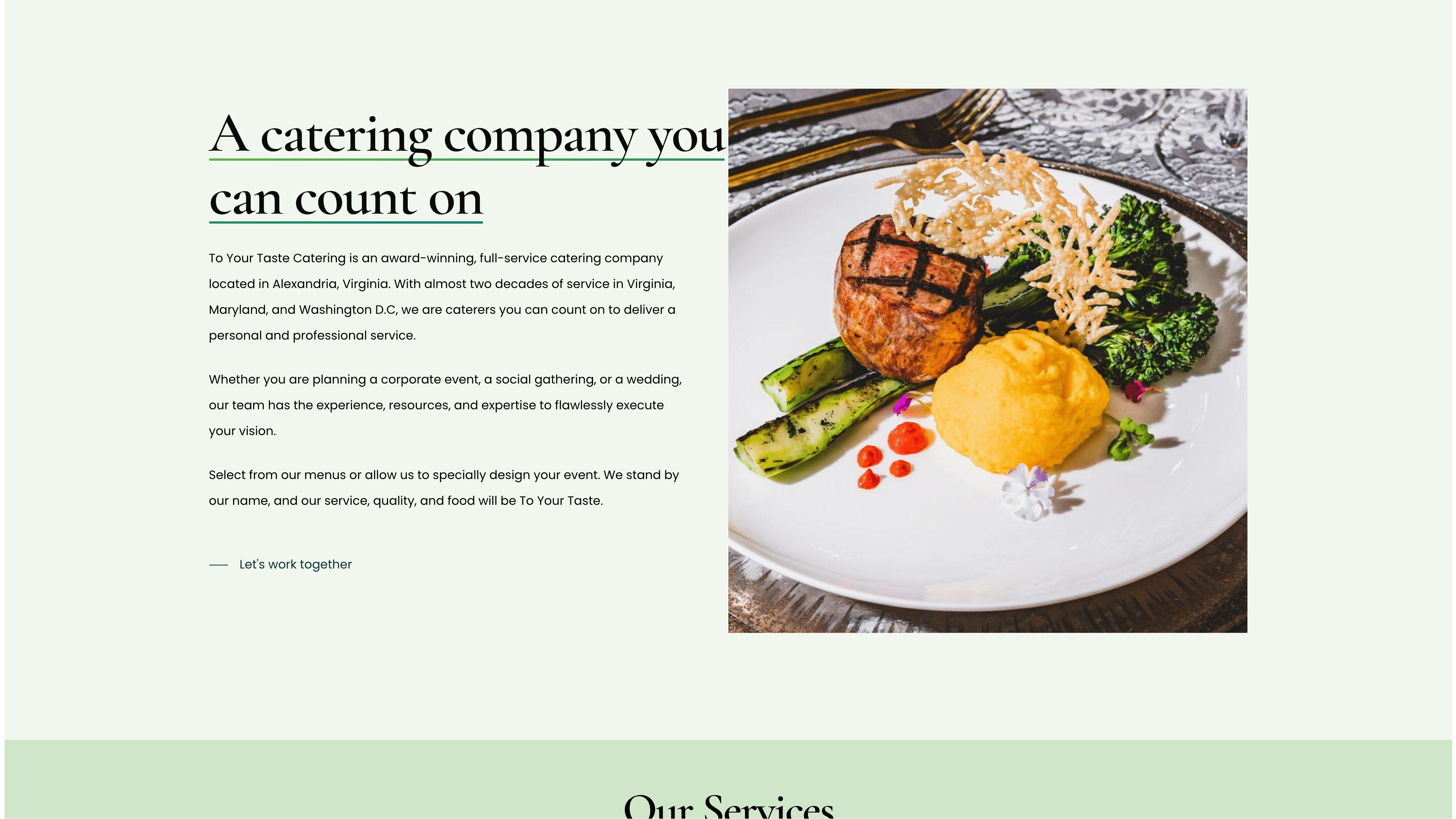 When “To Your Taste,” a gourmet food and catering service, approached Orpheus, Inc. for a website revamp, their vision was to have an online presence as flavorful and inviting as their offerings. Our goal was to design a digital space that not only showcased their exquisite cuisine and bespoke catering services but also reflected their passion for creating unforgettable culinary experiences. The final product is an elegant, easy-to-navigate website that effectively communicates “To Your Taste’s” commitment to quality and excellence in gastronomy. It serves as a delectable portal for food enthusiasts and event planners alike, highlighting the company’s unique ability to tailor experiences to each client’s taste, making every event a memorable feast. This website solidifies “To Your Taste” as the go-to choice for those seeking exceptional culinary craftsmanship and personalized service.